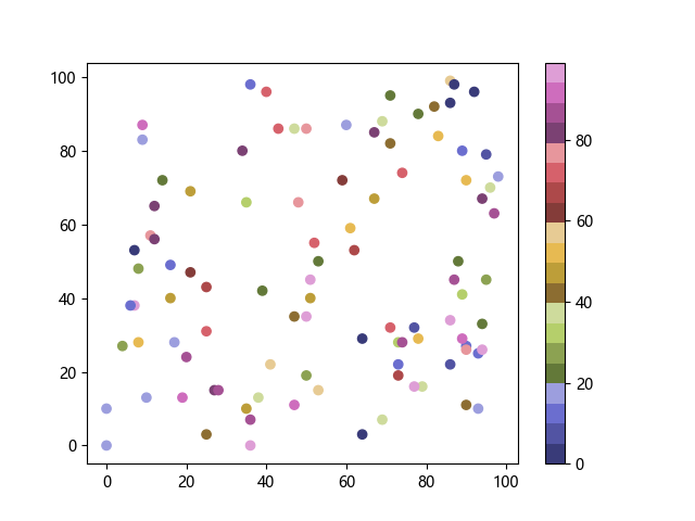 # 以下三行代码使编译器支持绘图功能: import sys import matplotlib matplotlib.use('Agg') import matplotlib.pyplot as plt import numpy as np # 生成随机数据: x = np.random.randint(100, size=(100)) y = np.random.randint(100, size=(100)) colors = np.random.randint(100, size=(100)) # 使用 tab20b 离散配色方案创建散点图: plt.scatter(x, y, c=colors, cmap='tab20b') plt.colorbar() plt.show() # 以下两行代码使编译器能够输出图形: plt.savefig(sys.stdout.buffer) sys.stdout.flush()