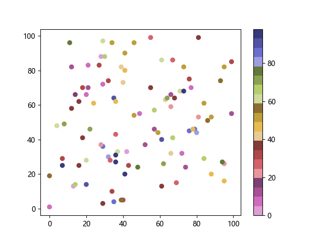 # 以下三行代码使编译器支持绘图功能: import sys import matplotlib matplotlib.use('Agg') import matplotlib.pyplot as plt import numpy as np # 生成随机数据: x = np.random.randint(100, size=(100)) y = np.random.randint(100, size=(100)) colors = np.random.randint(100, size=(100)) # 使用 tab20b 反向离散配色方案创建散点图: plt.scatter(x, y, c=colors, cmap='tab20b_r') plt.colorbar() plt.show() # 以下两行代码使编译器能够输出图形: plt.savefig(sys.stdout.buffer) sys.stdout.flush()