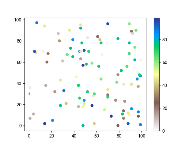 # 以下三行代码使编译器支持绘图功能: import sys import matplotlib matplotlib.use('Agg') import matplotlib.pyplot as plt import numpy as np # 生成随机数据: x = np.random.randint(100, size=(100)) y = np.random.randint(100, size=(100)) colors = np.random.randint(100, size=(100)) # 使用地形反向 (terrain_r) 配色方案创建散点图: plt.scatter(x, y, c=colors, cmap='terrain_r') plt.colorbar() plt.show() # 以下两行代码使编译器能够输出图形: plt.savefig(sys.stdout.buffer) sys.stdout.flush()