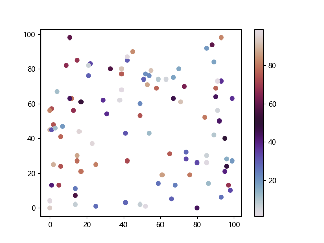 # 以下三行代码使编译器支持绘图功能: import sys import matplotlib matplotlib.use('Agg') import matplotlib.pyplot as plt import numpy as np # 生成随机数据: x = np.random.randint(100, size=(100)) y = np.random.randint(100, size=(100)) colors = np.random.randint(100, size=(100)) # 使用 twilight 配色方案创建散点图: plt.scatter(x, y, c=colors, cmap='twilight') plt.colorbar() plt.show() # 以下两行代码使编译器能够输出图形: plt.savefig(sys.stdout.buffer) sys.stdout.flush()