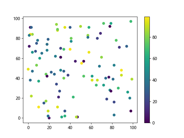 # 以下三行代码使编译器支持绘图功能: import sys import matplotlib matplotlib.use('Agg') import matplotlib.pyplot as plt import numpy as np # 生成随机数据: x = np.random.randint(100, size=(100)) y = np.random.randint(100, size=(100)) colors = np.random.randint(100, size=(100)) # 使用 viridis 配色方案创建散点图: plt.scatter(x, y, c=colors, cmap='viridis') plt.colorbar() plt.show() # 以下两行代码使编译器能够输出图形: plt.savefig(sys.stdout.buffer) sys.stdout.flush()