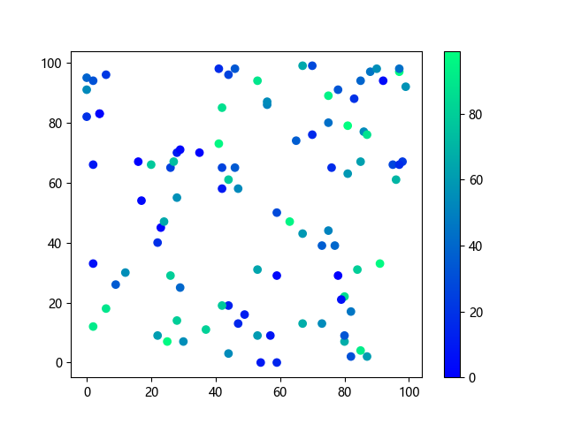 # 以下三行代码使编译器支持绘图功能: import sys import matplotlib matplotlib.use('Agg') import matplotlib.pyplot as plt import numpy as np # 生成随机数据: x = np.random.randint(100, size=(100)) y = np.random.randint(100, size=(100)) colors = np.random.randint(100, size=(100)) # 使用冬季 (winter) 配色方案创建散点图: plt.scatter(x, y, c=colors, cmap='winter') plt.colorbar() plt.show() # 以下两行代码使编译器能够输出图形: plt.savefig(sys.stdout.buffer) sys.stdout.flush()
