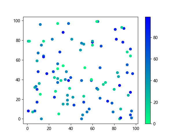 # 以下三行代码使编译器支持绘图功能: import sys import matplotlib matplotlib.use('Agg') import matplotlib.pyplot as plt import numpy as np # 生成随机数据: x = np.random.randint(100, size=(100)) y = np.random.randint(100, size=(100)) colors = np.random.randint(100, size=(100)) # 使用冬季反向 (winter_r) 配色方案创建散点图: plt.scatter(x, y, c=colors, cmap='winter_r') plt.colorbar() plt.show() # 以下两行代码使编译器能够输出图形: plt.savefig(sys.stdout.buffer) # 将图形保存到标准输出缓冲区 sys.stdout.flush() # 刷新输出缓冲区