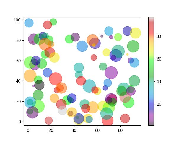 # 以下三行代码使编译器支持绘图功能: import sys import matplotlib matplotlib.use('Agg') import matplotlib.pyplot as plt import numpy as np # 生成随机数据: x = np.random.randint(100, size=(100)) y = np.random.randint(100, size=(100)) colors = np.random.randint(100, size=(100)) sizes = 10 * np.random.randint(100, size=(100)) # 点大小(10-990随机值) # 使用光谱配色、半透明效果创建散点图: plt.scatter(x, y, c=colors, s=sizes, alpha=0.5, cmap='nipy_spectral') plt.colorbar() plt.show() # 以下两行代码使编译器能够输出图形: plt.savefig(sys.stdout.buffer) sys.stdout.flush()