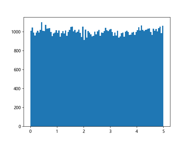 # 使编译器支持绘图的三行配置: import sys import matplotlib matplotlib.use('Agg') import numpy import matplotlib.pyplot as plt x = numpy.random.uniform(0.0, 5.0, 100000) plt.hist(x, 100) plt.show() # 实现编译器绘图功能的两行代码: plt.savefig(sys.stdout.buffer) sys.stdout.flush()