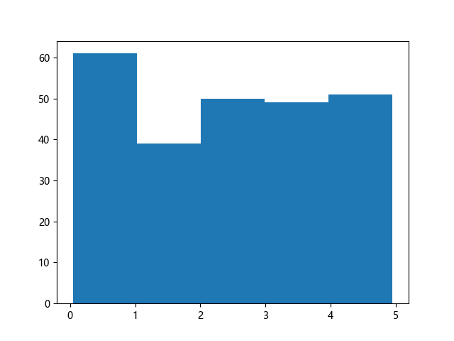 # 使我们的编译器能够绘制的三行代码: import sys import matplotlib matplotlib.use('Agg') import numpy import matplotlib.pyplot as plt x = numpy.random.uniform(0.0, 5.0, 250) plt.hist(x, 5) plt.show() # 使我们的编译器能够绘制的两行代码: plt.savefig(sys.stdout.buffer) sys.stdout.flush()