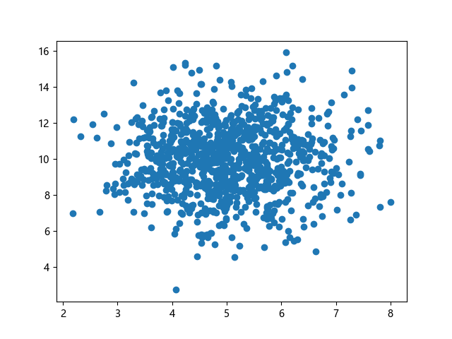 # 三行配置使编译器支持绘图功能: import sys import matplotlib matplotlib.use('Agg') import numpy import matplotlib.pyplot as plt # 生成正态分布数据:x~N(5.0,1.0),y~N(10.0,2.0),各 1000 个样本点: x = numpy.random.normal(5.0, 1.0, 1000) y = numpy.random.normal(10.0, 2.0, 1000) # 绘制散点图 plt.scatter(x, y) plt.show() # 两行代码实现图形输出: plt.savefig(sys.stdout.buffer) sys.stdout.flush()
