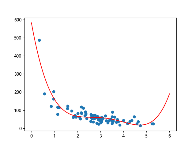# 三行配置使编译器支持绘图功能: import sys import matplotlib matplotlib.use('Agg') import numpy import matplotlib.pyplot as plt numpy.random.seed(2) # 生成正态分布随机数据: x = numpy.random.normal(3, 1, 100) # 均值=3,标准差=1 y = numpy.random.normal(150, 40, 100) / x # 均值=150,标准差=40 # 划分训练集和测试集: # 前 80 个样本作为训练集: train_x = x[:80] train_y = y[:80] # 后 20 个样本作为测试集: test_x = x[80:] test_y = y[80:] # 使用三次多项式拟合训练数据,3 表示三次多项式: mymodel = numpy.poly1d(numpy.polyfit(train_x, train_y, 4)) # 生成拟合曲线的x坐标点,从 0 到 6 生成 100 个等距点: myline = numpy.linspace(0, 6, 100) # 绘制训练集散点图和拟合曲线 plt.scatter(train_x, train_y) # 训练数据散点图 plt.plot(myline, mymodel(myline), color='red') # 红色拟合曲线 plt.show() # 两行代码实现图形输出: plt.savefig(sys.stdout.buffer) sys.stdout.flush()