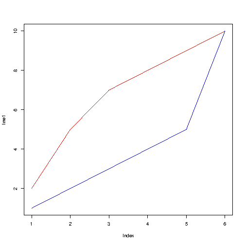 line1 <- c(1,2,3,4,5,10) line2 <- c(2,5,7,8,9,10) plot(line1, type = "l", col = "blue") lines(line2, type="l", col = "red")