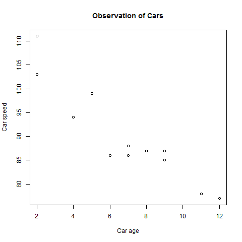 # 我们需要这行代码才能在编译器中显示图表 png(filename="output.png") x <- c(5,7,8,7,2,2,9,4,11,12,9,6) y <- c(99,86,87,88,111,103,87,94,78,77,85,86) # 绘制 x 和 y 的散点图,并添加标题和坐标轴标签: plot(x, y, main="Observation of Cars", xlab="Car age", ylab="Car speed")