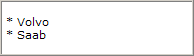 <fo:list-block> <fo:list-item> <fo:list-item-label> <fo:block>*</fo:block> </fo:list-item-label> <fo:list-item-body> <fo:block>Volvo</fo:block> </fo:list-item-body> </fo:list-item> <fo:list-item> <fo:list-item-label> <fo:block>*</fo:block> </fo:list-item-label> <fo:list-item-body> <fo:block>Saab</fo:block> </fo:list-item-body> </fo:list-item> </fo:list-block>